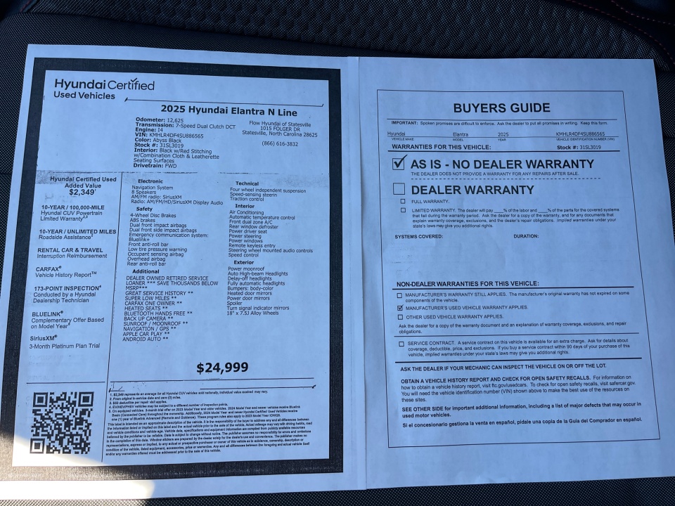 ** All of our cars go through a comprehensive QRP Quality Renewal Process. Come check out Flow Hyundai of Statesville's No haggle, No Pressure, Transparent, Easy, Fun, car shopping experience!! We have the most professional and courteous sales staff in North Carolina. Call Internet Sales Dept at (866)616-3832 to set schedule a test drive, or https://www.flowhyundaistatesville.com . Thank you for allowing us to serve your automotive needs over the past 50 years.