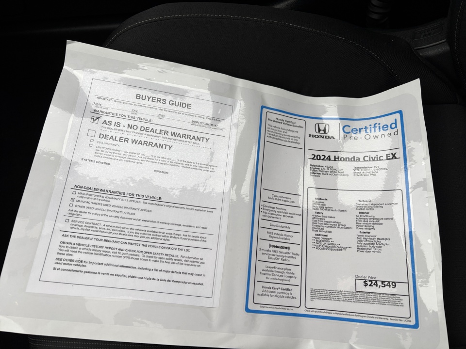 Flow Honda is proud to offer this great 2024 Honda Civic Platinum White Pearl EX with the following features: