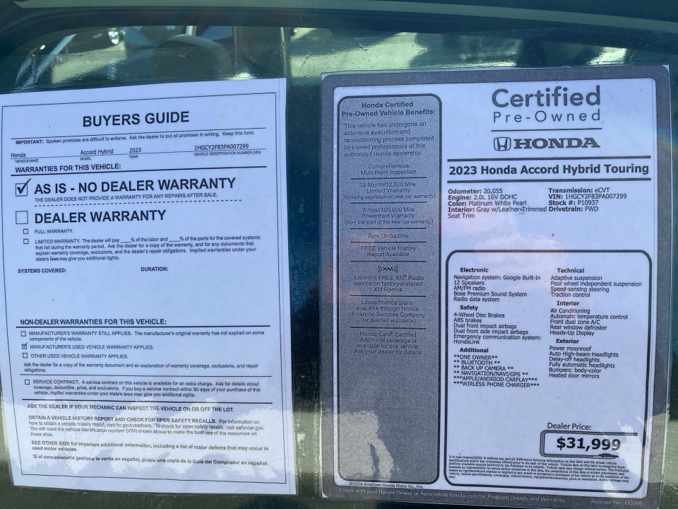 Flow Honda is excited to offer this great 2023 Honda Accord Hybrid Platinum White Pearl Touring with the following features: