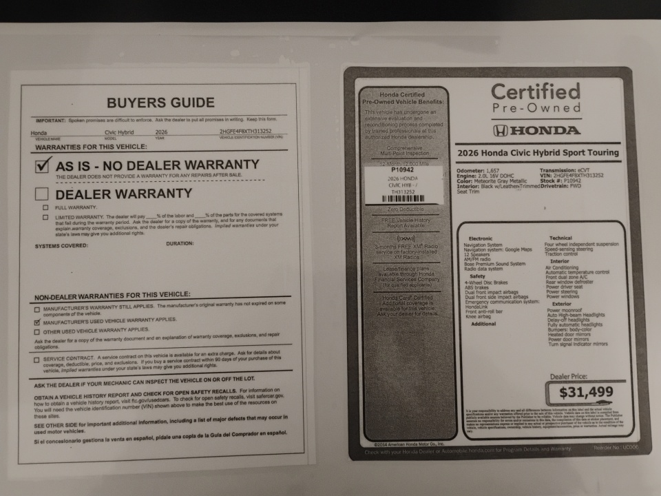Flow Honda is pumped up to offer this great 2026 Honda Civic Hybrid Meteorite Gray Metallic Sport Touring with the following features: