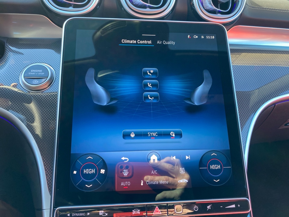 Inside, the cabin blends sport and sophistication. AMG sport seats, a multifunction sport steering wheel, metal weave trim, and a black headliner create a driver focused environment. Heated and ventilated front seats, a heated steering wheel, dual zone climate control, and hands-free access ensure comfort in every season, while enhanced ambient lighting adds a refined, modern feel.