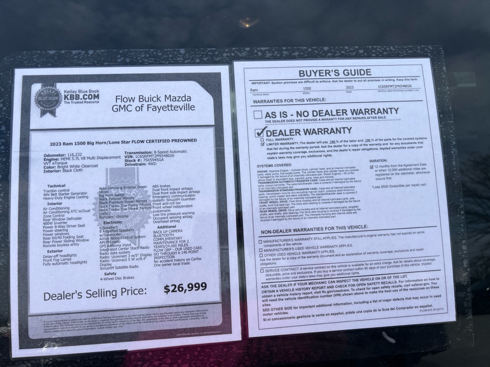 Flow Buick Mazda GMC of Fayetteville is delighted to offer this great-looking 2023 Ram 1500 Bright White Clearcoat Big Horn/Lone Star with the following features: FLOW CERTIFIED 12 MONTHS/12000 MILE POWERTRAIN WARRANTY, 3 day money back guarantee, and a free maintenance package! ** BACK UP CAMERA, BLUETOOTH, COMPLIMENTARY MAINTENANCE FOR 2 YEARS/24,000 MILES, FLOW QRP - OUR USED CARS GO THROUGH A 146 POINT INSPECTION, No accident history on Carfax, One owner local trade, 1500 Big Horn/Lone Star FLOW CERTIFIED PREOWNED, 4D Crew Cab, HEMI 5.7L V8 Multi Displacement VVT eTorque, 8-Speed Automatic, 4WD, Bright White Clearcoat, Black Cloth, 115V Auxiliary Power Outlet, 2nd Row In Floor Storage Bins, 400W Inverter, 4G LTE Wi-Fi Hot Spot, 8.4" Touchscreen Display, 9 Amplified Speakers w/Subwoofer, Air Conditioning ATC w/Dual Zone Control, Apple CarPlay, Auto-Dimming Exterior Driver Mirror, Auto-Dimming Rear-View Mirror, Big Horn Badge, Big Horn Level 2 Equipment Group (DISC), Black Exterior Mirrors, Black Premium Power Mirrors, Black Trailer Tow Power Mirrors, Bluetooth Handsfree Phone & Audio, Class IV Receiver Hitch, Cluster 7.0" TFT Color Display, Connectivity - US/Canada, Convex Wide-Angle Exterior Mirror Insert, Electric Shift-On-Demand Transfer Case, Exterior Mirrors Courtesy Lamps, Exterior Mirrors w/Heating Element, Exterior Mirrors w/Supplemental Signals, For Details, Visit DriveUconnect.com, For More Info, Call 800-643-2112, Front Fog Lamps, Glove Box Lamp, Google Android Auto, GPS Antenna Input, Heated Front Seats, Heated Steering Wheel, Integrated Center Stack Radio, LED Footwell Lighting, Media Hub w/2 Charge Only USBs, ParkSense Front/Rear Park Assist w/Stop, Power 2-Way Driver Lumbar Adjust, Power 8-Way Driver Seat, Power Adjustable Pedals, Power-Folding Mirrors, Protection Group, Quick Order Package 27Z Big Horn, Radio: Uconnect 5 W w/8.4" Display, Rear Dome w/On/Off Switch Lamp, Rear Power Sliding Window, Rear Window Defroster, Remote Start System, Securit