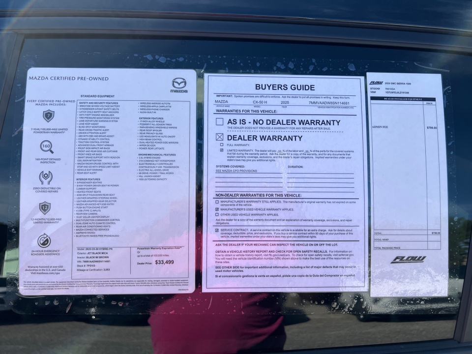 Flow Buick Mazda GMC of Fayetteville is pleased to offer this attractive 2025 Mazda CX-50 Hybrid Jet Black Mica Premium with the following features: MAZDA CERTIFIED**7 YEAR/100,000 MILE WARRANTY**BUY WITH PEACE OF MIND, LEATHER, BACK UP CAMERA, BLUETOOTH, COMPLIMENTARY MAINTENANCE FOR 2 YEARS/24,000 MILES, Excellent condition, CX-50 Hybrid Premium MAZDA CERTIFIED PREOWNED, 4D Sport Utility, 2.5L 4-Cylinder, eCVT, AWD, Jet Black Mica, Black W/Brown Leather. Mazda Certified Pre-Owned Details: