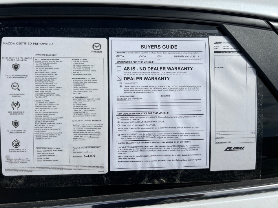Flow Buick Mazda GMC of Fayetteville is honored to offer this good-looking 2025 Mazda CX-30 Snowflake White Pearl Mica 2.5 S Preferred Package with the following features: MAZDA CERTIFIED**7 YEAR/100,000 MILE WARRANTY**BUY WITH PEACE OF MIND, SUNROOF, BACK UP CAMERA, BLUETOOTH, COMPLIMENTARY MAINTENANCE FOR 2 YEARS/24,000 MILES, No accident history on Carfax, One owner local trade, CX-30 2.5 S Preferred Package MAZDA CERTIFIED PREOWNED, 4D Sport Utility, SKYACTIV® 2.5L 4-Cylinder DOHC 16V, 6-Speed Automatic, AWD, Snowflake White Pearl Mica, Greige W/Black Artificial Leather. Mazda Certified Pre-Owned Details: