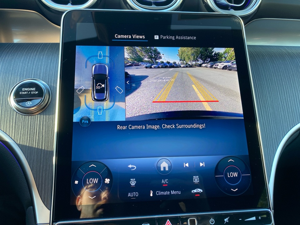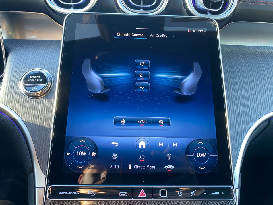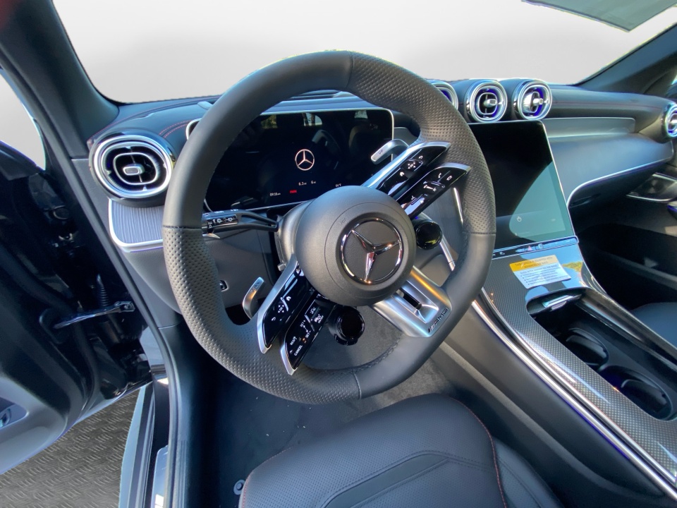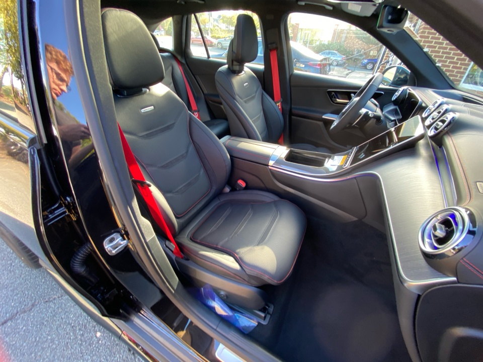 Inside, the Pinnacle Line cabin blends craftsmanship and technology with AMG Sport Seats, a Nappa Leather AMG Performance Steering Wheel, Fineline Anthracite Wood Trim, and red seat belts. Heated and ventilated front seats, a heated steering wheel, and ENERGIZING ambient lighting ensure every drive is tailored to you. The Burmester® Surround Sound System, Head-Up Display, and advanced MBUX infotainment with Augmented Reality Navigation and dual 12.3” displays make every journey immersive and intuitive.