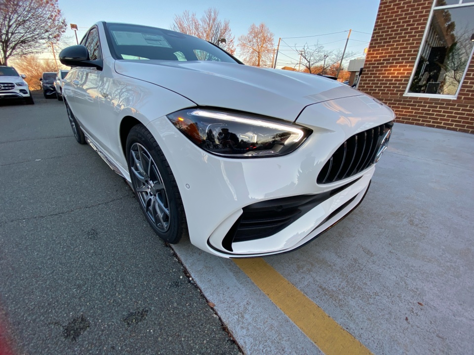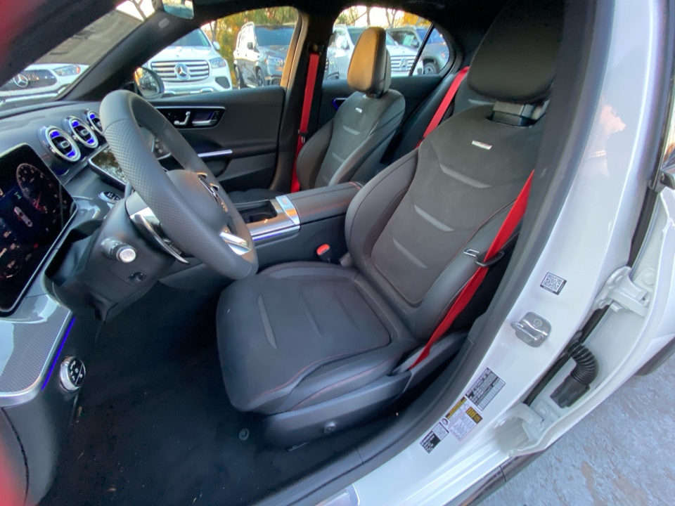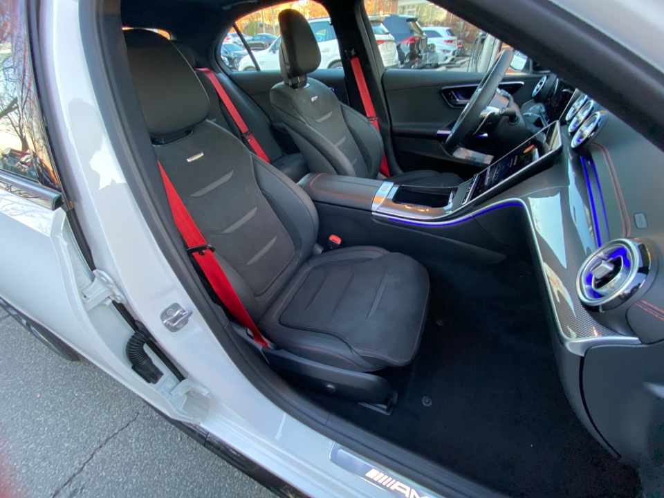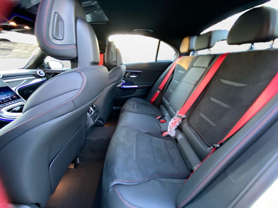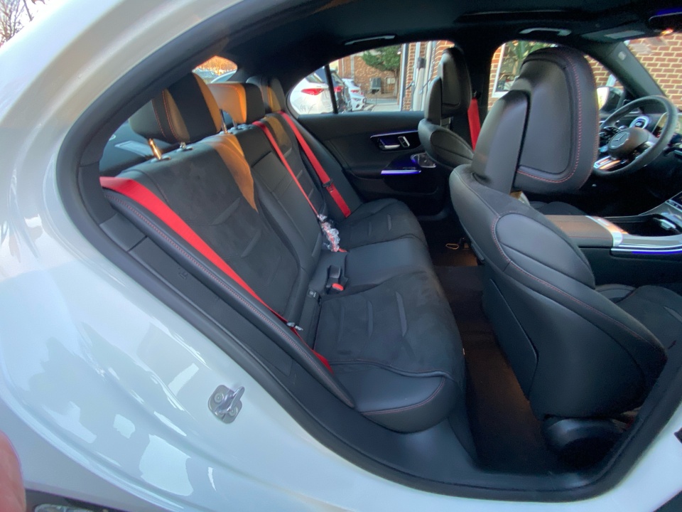 Finished in Polar White over Black MB-Tex and Microfiber with red accents, this AMG C 43 delivers a distinctive presence. The AMG Night Package, subtle metallic finish, and red seat belts hint at its performance pedigree. The sport seats, AMG body styling, and metal weave center console combine athletic intent with refined detail, while the glass sunroof and sleek profile give it coupe-like flair in a sedan package.