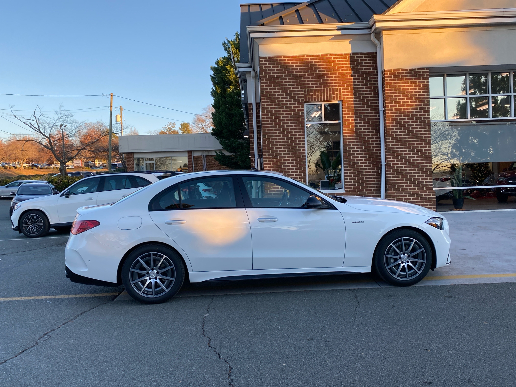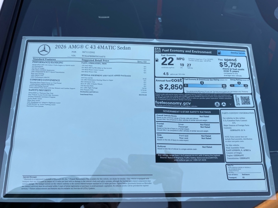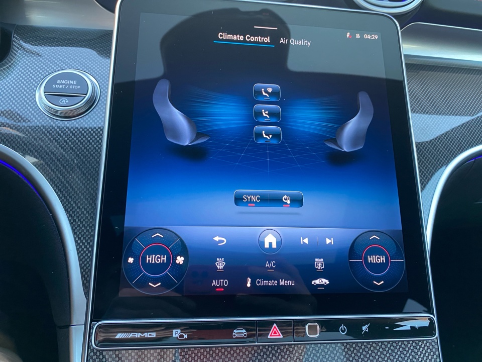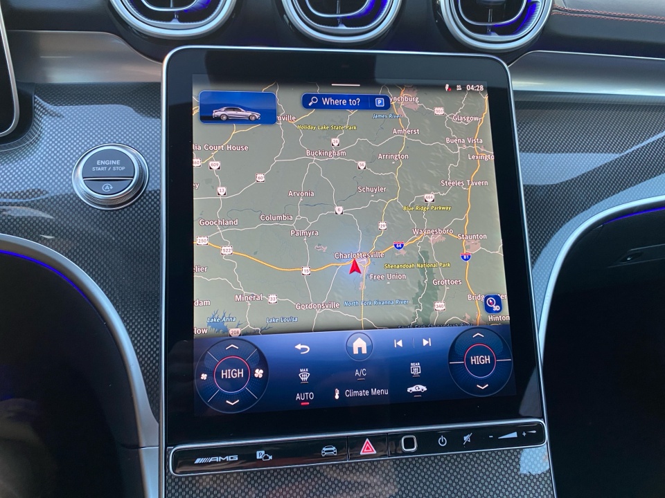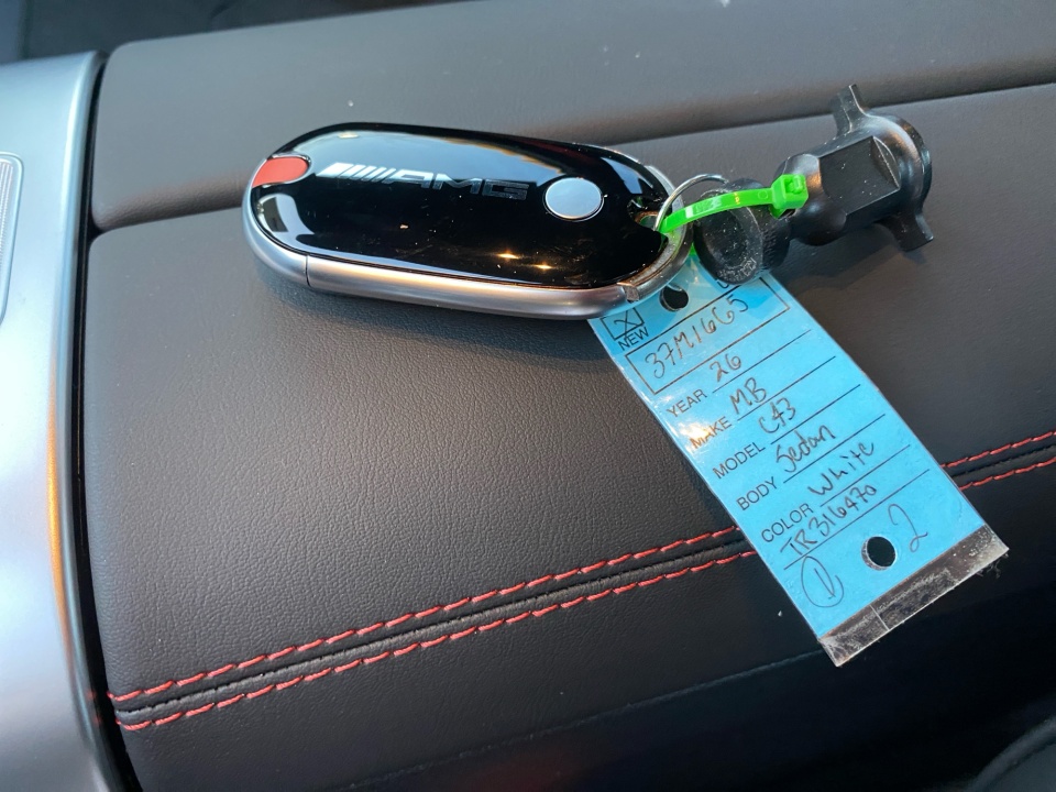 Finished in Polar White over Black MB-Tex and Microfiber with red accents, this AMG C 43 delivers a distinctive presence. The AMG Night Package, subtle metallic finish, and red seat belts hint at its performance pedigree. The sport seats, AMG body styling, and metal weave center console combine athletic intent with refined detail, while the glass sunroof and sleek profile give it coupe-like flair in a sedan package.