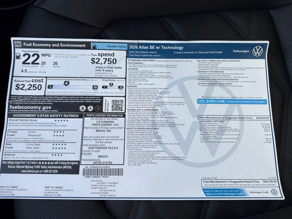 2026 Atlas Volkswagen | 2.0T SE w/Technology 4MOTION | 4 miles
