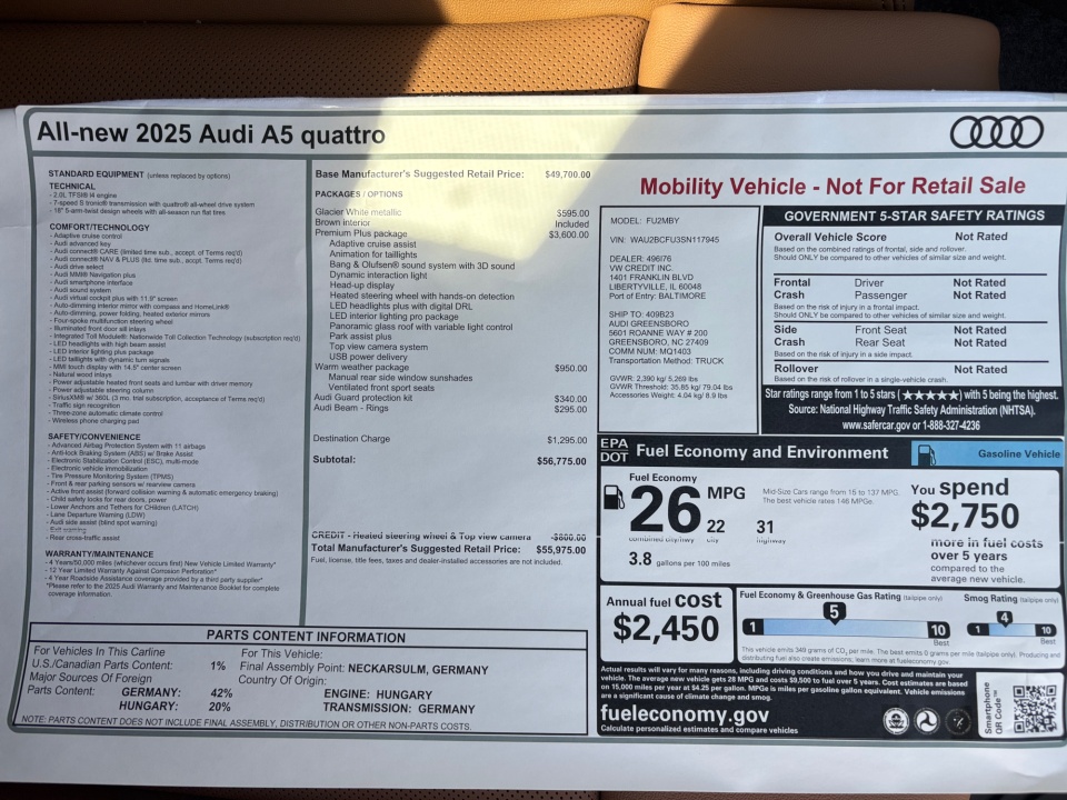 2025 All-new A5 Audi | Premium Plus 2.0 TFSI quattro | 22 miles