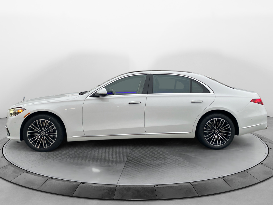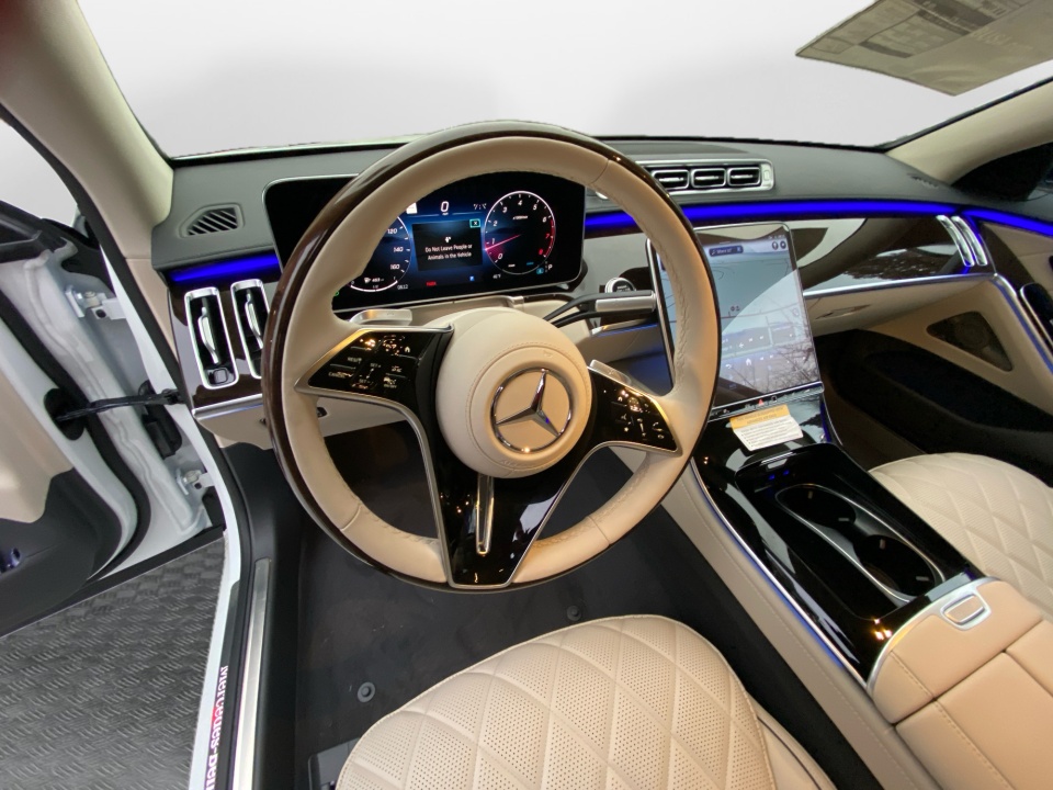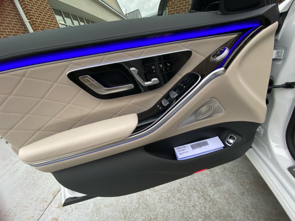 Finished in MANUFAKTUR Moonlight White Metallic with a Macchiato Beige and Magma Grey Nappa leather interior, this S-Class delivers a refined presence with unmistakable craftsmanship. Subtle exterior details like 19-inch multispoke wheels with black accents, LED headlamps, surround view camera, and soft-close doors reinforce its flagship status.