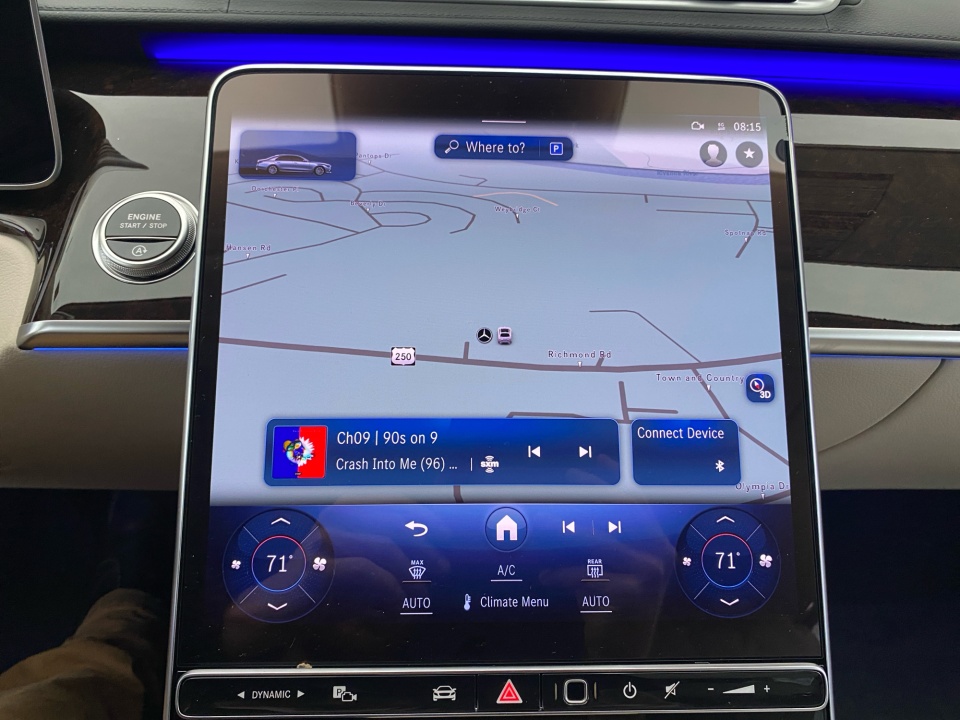 Inside, the cabin is designed around comfort and innovation. Heated and ventilated front seats with active multicontour massage, comfort headrests, rapid heating, and AIR BALANCE create a first class driving experience. The wood and leather steering wheel, high gloss brown burl walnut trim, Macchiato Beige headliner, and ambient lighting elevate every detail. Rear passengers benefit from power sunshades, independent trunk locking, and a serene, insulated cabin.