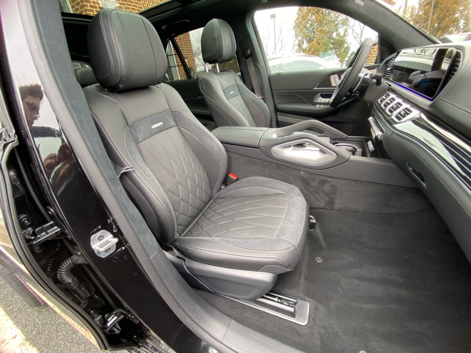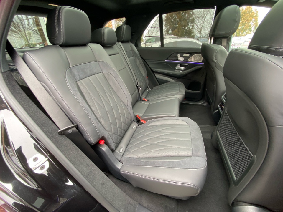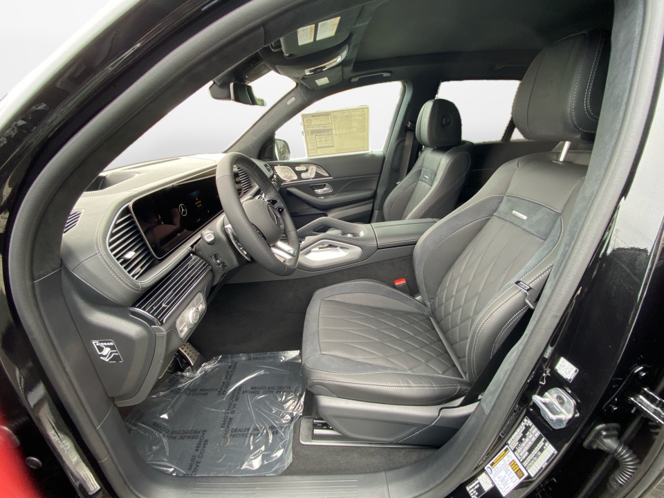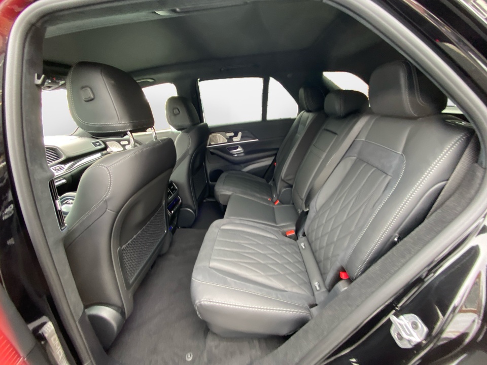 Finished in Obsidian Black Metallic with AMG Black Exclusive Nappa leather and diamond stitching, this GLE 63S makes a bold, purposeful statement. The AMG Night Package, AMG exterior styling, and 22-inch AMG cross-spoke forged wheels in matte black give it an aggressive stance, while red brake calipers and quad exhaust outlets hint at the performance beneath. Subtle touches like illuminated door sills and privacy glass complete the look.