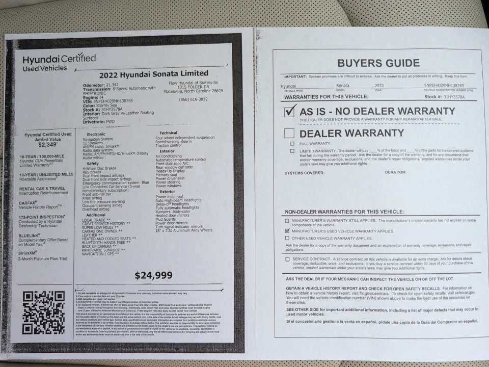 POWER FRONT HEATED AND COOLED SEATS LEATHER SEATS**, BACK UP CAMERA **, PANORAMIC SUNROOF **,10.25-INCH TOUCHSRENN NAVIGATION SYSTEM, APPLE CAR PLAY **, ANDROID AUTO **, BOSE SOUND, BLIND SPOT MONITOR / DRIVER ASSISTANCE PACKAGE **, PUSH BUTTON START **, REMOTE START **, FACTORY MAINTENANCE UP TO DATE **, REMAINDER OF FACTORY WARRANTY **, 18" ALLOY WHEELS **, Hyundai Certified Used Vehicles Details: