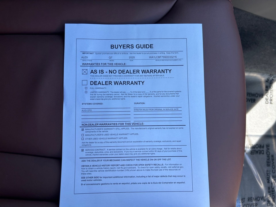 Audi Greensboro is excited to offer this great 2025 Audi Q7 Sakhir Gold Metallic 45 Premium Plus with the following features: LEATHER**, HEATED SEATS**, BLUETOOTH HANDSFREE**, BACK UP CAMERA**, 7-Pin Adapter, Bang & Olufsen Premium Sound System with 3D Sound, Convenience Package, Heated Steering Wheel, Illuminated Door Sills, LED Interior Lighting Package Plus, Premium Plus Package, Top View Camera System, Trailer Hitch, Wheels: 20" 5-Double-Spoke Bicolor Finish, Wireless Phone Charging Pad. CARFAX One-Owner. Clean CARFAX.