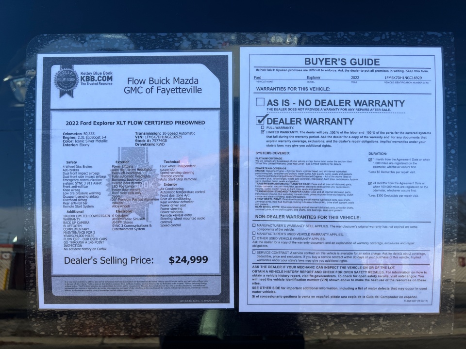 Flow Buick Mazda GMC of Fayetteville is very proud to offer this good-looking 2022 Ford Explorer Iconic Silver Metallic XLT with the following features: FLOW CERTIFIED 2YR/100,000 MILE POWERTRAIN WARRANTY, 3 day money back guarantee, and a free maintenance package! ** 100,000 LIMITED POWERTRAIN WARRANTY, BACK UP CAMERA, BLUETOOTH, COMPLIMENTARY MAINTENANCE FOR 2 YEARS/24,000 MILES, FLOW QRP - OUR USED CARS GO THROUGH A 146 POINT INSPECTION, No accident history on Carfax, Explorer XLT FLOW CERTIFIED PREOWNED, 4D Sport Utility, 2.3L EcoBoost I-4, 10-Speed Automatic, RWD, Iconic Silver Metallic, Ebony Leatherette. Priced below KBB Fair Purchase Price!