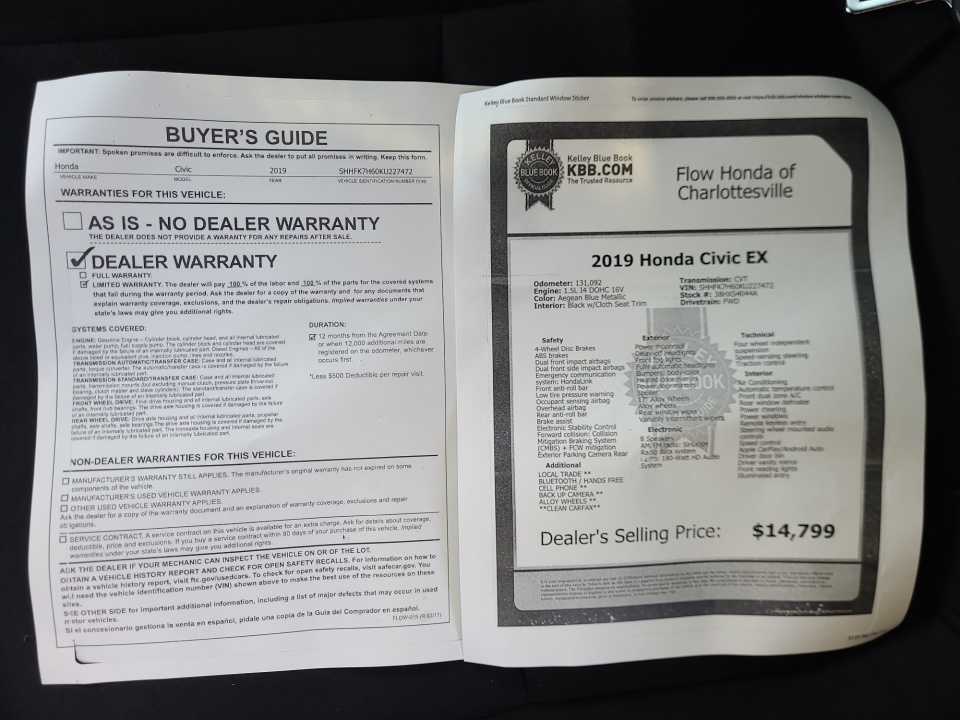 FLOW CERTIFIED! 12 MONTHS/12000 MILE WARRANTY, 3 day money back guarantee, and a free maintenance package on this 2019 Honda Civic Aegean Blue Metallic EX! **