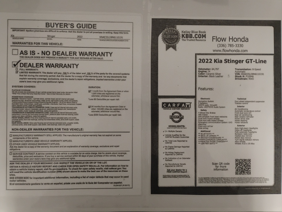 FLOW CERTIFIED! 2YR/100,000 MILE WARRANTY and a free maintenance package on this 2022 Kia Stinger Ceramic Silver GT-Line! **