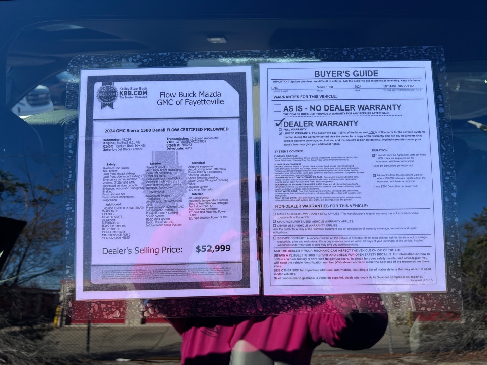 Flow Buick Mazda GMC of Fayetteville is very proud to offer this wonderful-looking 2024 GMC Sierra 1500 Titanium Rush Metallic Denali with the following features: FLOW CERTIFIED 2YR/100,000 MILE POWERTRAIN WARRANTY, 3 day money back guarantee, and a free maintenance package! ** 100,000 LIMITED POWERTRAIN WARRANTY, LEATHER, HEATED SEATS, SUNROOF, NAVIGATION, BACK UP CAMERA, BLUETOOTH, COMPLIMENTARY MAINTENANCE FOR 2 YEARS/24,000 MILES, FLOW QRP - OUR USED CARS GO THROUGH A 146 POINT INSPECTION, No accident history on Carfax, One owner local trade, Sierra 1500 Denali FLOW CERTIFIED PREOWNED, 4D Crew Cab, EcoTec3 6.2L V8, 10-Speed Automatic, 4WD, Titanium Rush Metallic, Jet Black Leather, 120-Volt Bed Mounted Power Outlet, 120-Volt Interior Power Outlet, 170 Amp Alternator, 2 Charge/Data USB Ports Inside Center Console, 2 Type-C Charge-Only Rear USB Ports, 2 USB Ports, Auto-Locking Rear Differential, Auxiliary External Transmission Oil Cooler, Bed View Camera, Chrome Header w/Signature Denali Chrome Grille, Chrome Recovery Hooks, Chrome Wheel To Wheel Assist Steps, Color-Keyed Carpeting Floor Covering, Deep-Tinted Glass, Denali Reserve Super Package, Electric Rear-Window Defogger, Floor-Mounted Center Console, Front Rain-Sensing Wipers, GMC Connected Access Capable, GMC MultiPro Power Steps, HD Surround Vision, Heated 2nd Row Outboard Seats, Heated Driver & Front Outboard Passenger Seating, Heavy-Duty Air Filter, Hill Descent Control, Hitch Guidance, Hitch View, In-Vehicle Trailering System App, Integrated Trailer Brake Controller, Keyless Open & Start, LED Cargo Area Lighting, Multicolor 15" Diagonal Head-Up Display, Navigation System, OnStar & GMC Connected Services Capable, Perimeter Lighting, Power Door Locks, Power Front Passenger Windows w/Express Up/Down, Power Front Windows w/Driver Express Up/Down, Power Rake & Telescoping Steering Column, Power Rear Windows w/Express Down, Power Sliding Rear Window w/Rear Defogger, Power Sunroof, Preferred Equipment Group 5SA