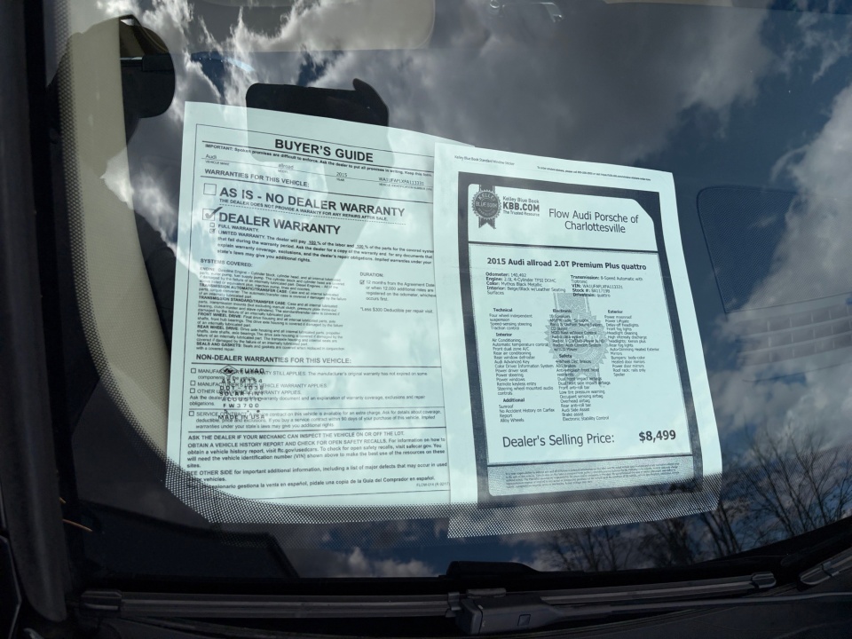 FLOW CERTIFIED! 12 MONTHS/12000 MILE WARRANTY, 3 day money back guarantee, and a free maintenance package on this 2015 Audi allroad Mythos Black Metallic 2.0T Premium Plus! **