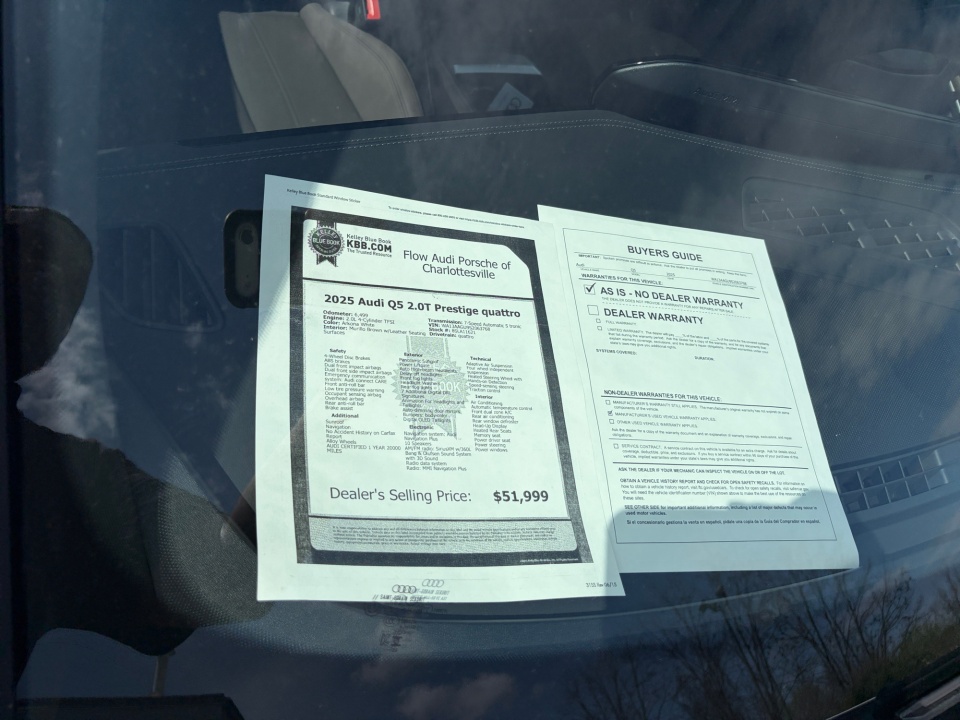 Flow Audi Porsche of Charlottesville is very proud to offer this wonderful 2025 Audi Q5 Arkona White 2.0T Prestige.