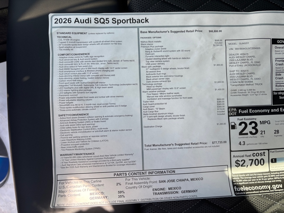 2026 Audi SQ5 Sportback | Premium Plus 3.0 TFSI quattro | 21 miles